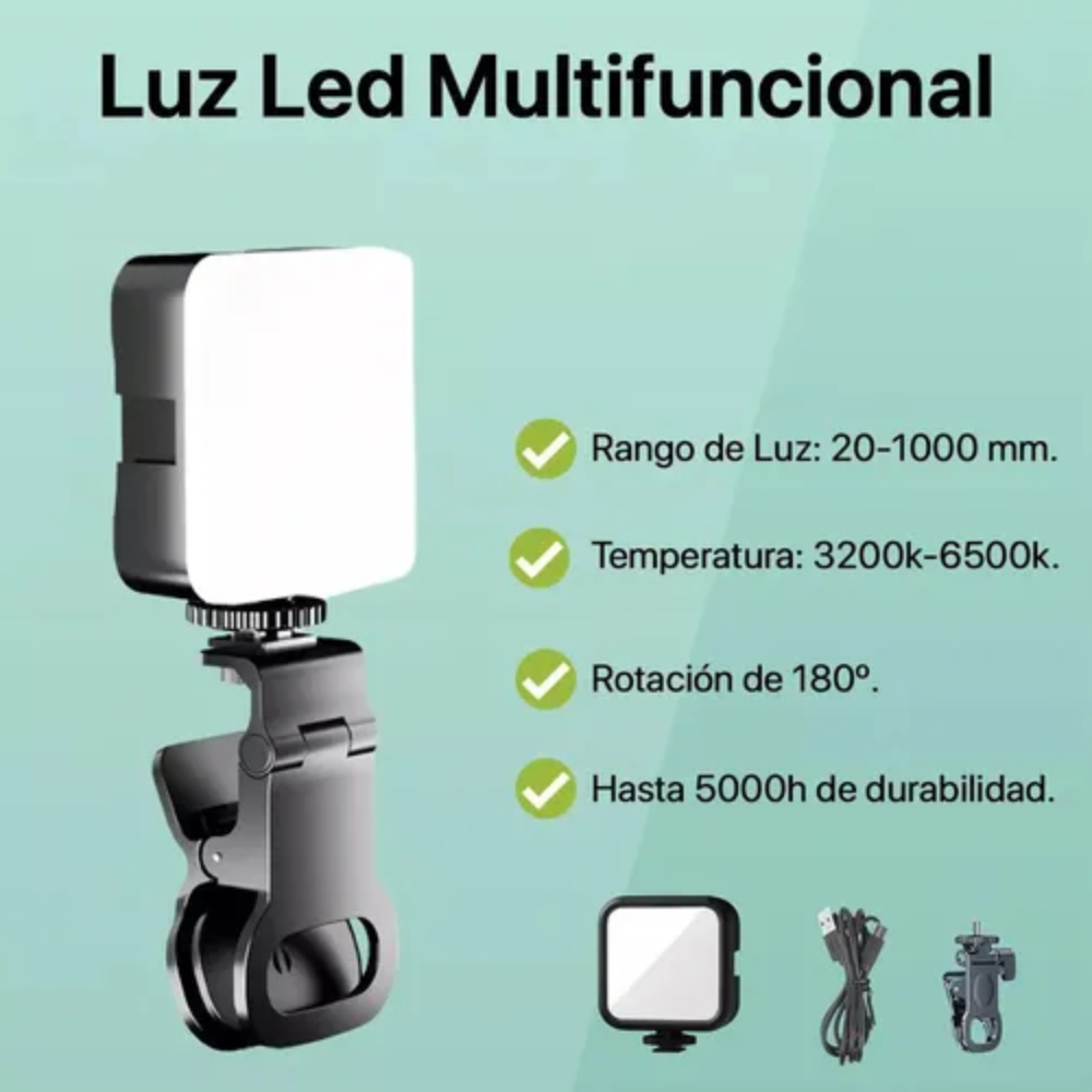La luz LED RGB recargable es una herramienta esencial para videógrafos y creadores de contenido. Esta luz LED es ligera y de tamaño pequeño, ideal para llevar en viajes o negocios.ESPECIFICACIONES:Modelo: AY-83Potencia Máxima: 5.5WÁngulo de Iluminación: 60 gradosVida útil de los LEDs: 50000 horasIntensidad Luminosa: 800 lúmenesRango de Temperatura de Color: de 3200K a 6500KÍndice de Reproducción Cromática: Superior al 90%Cantidad Total de LEDS: 185 LEDsLuz blanca: 49 LEDs (Únicamente blancos para que tenga más intensidad cuando está en modo blanco)INCLUYE:1 Luz LED RGB 1 Cable USB1 Soporte clip para celular